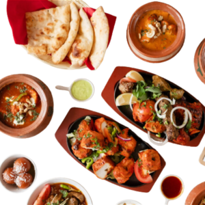 1 chicken biryani, 1 butter chicken , 1 saag paneer, 2 rice, 2 naan, gulab jamun, Papadam, 2 veg samosa, 2 mango lassi Raita, mint sauce,